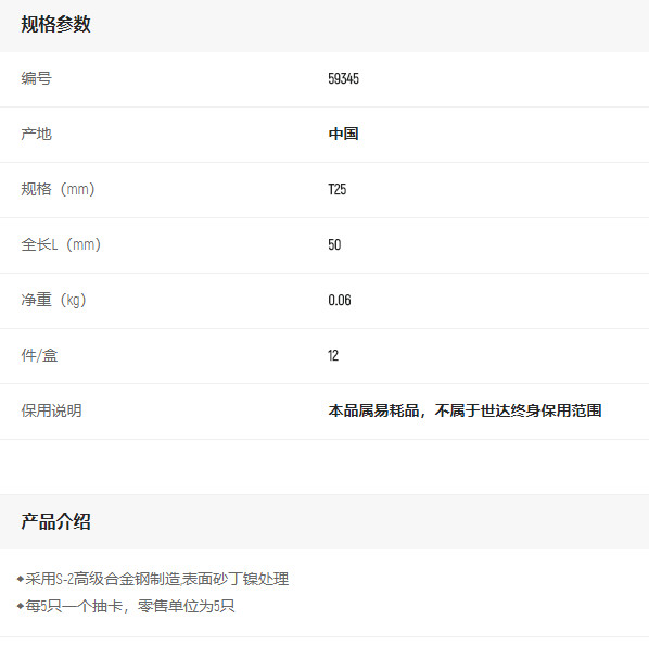 產品名字:世達5件套6.3mm系列50mm長中孔花型旋具頭TT25