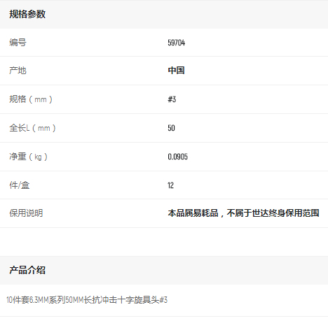 產品名字:世達10件套6.3MM系列50mm長十字旋具頭#3
