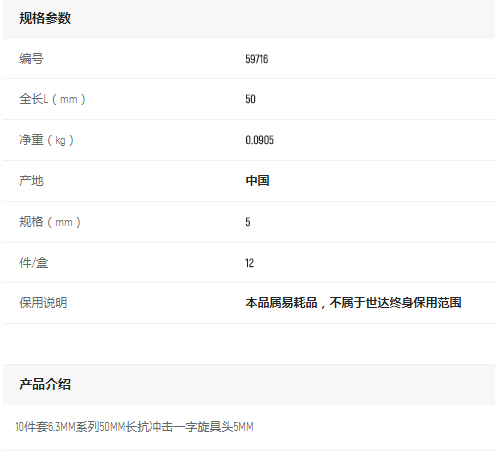 產品名字:世達10件套6.3MM系列50mm長一字旋具頭5MM