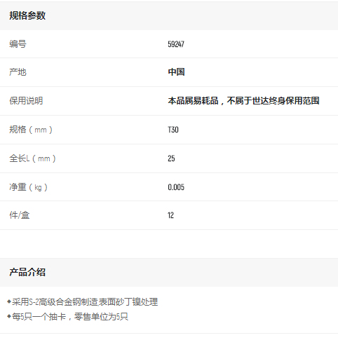 首頁>產品中心>螺絲批>旋具頭>世達6.3mm系列25mm長中孔花型旋具頭T30