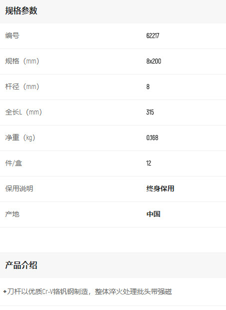 首頁>產品中心>螺絲批>一字螺絲批>世達A系列一字批8x200mm