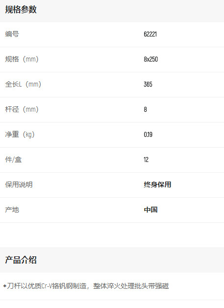 首頁>產品中心>螺絲批>一字螺絲批>世達A系列一字批8*250mm