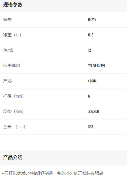 首頁>產品中心>螺絲批>十字螺絲批>世達A系列十字批#2*250